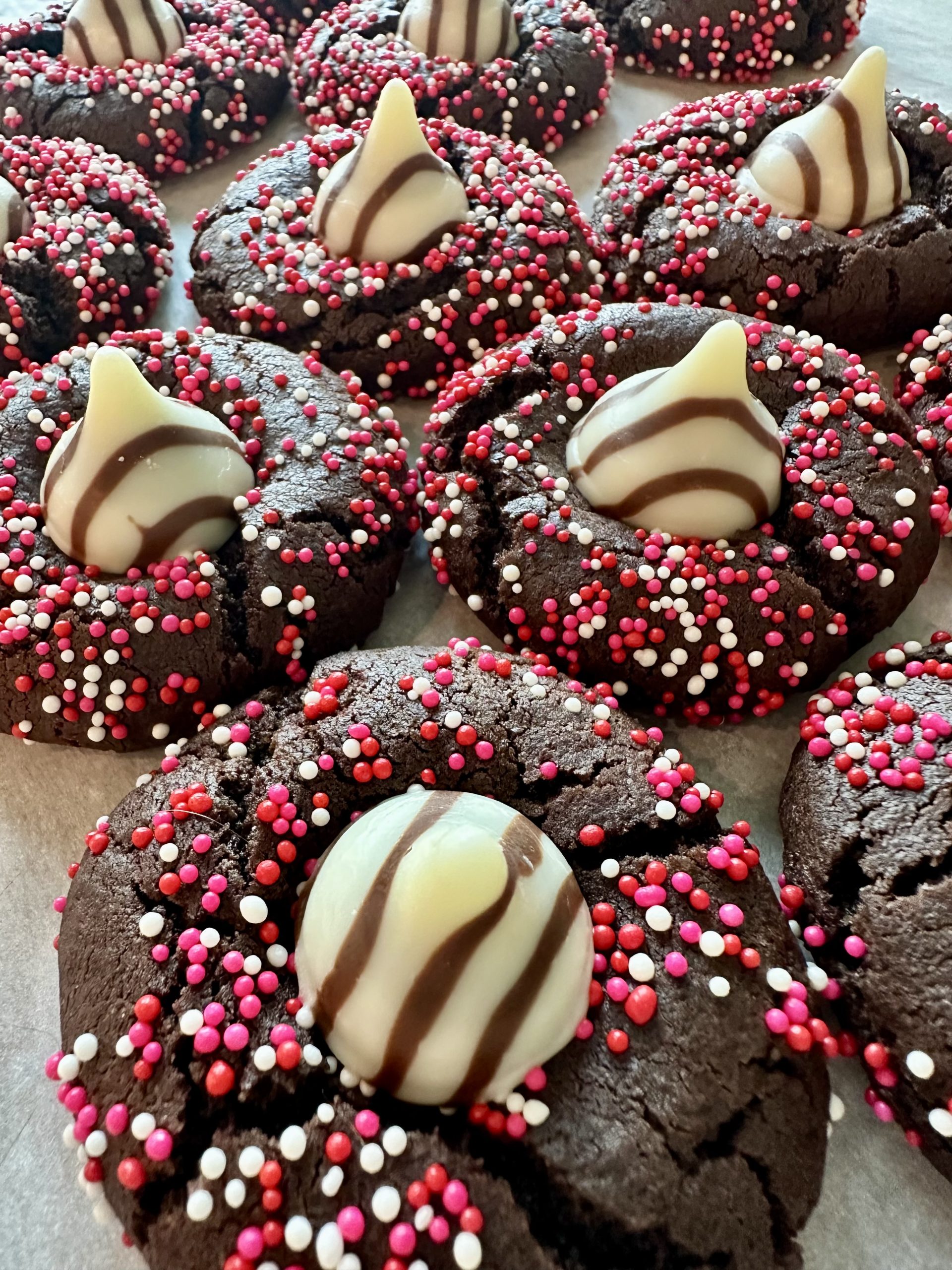 These rich chocolate cookies are made with Dutch cocoa, rolled in Valentines sprinkles and topped with a white chocolate fudgy kiss! Available for a limited time. One dozen to an order.