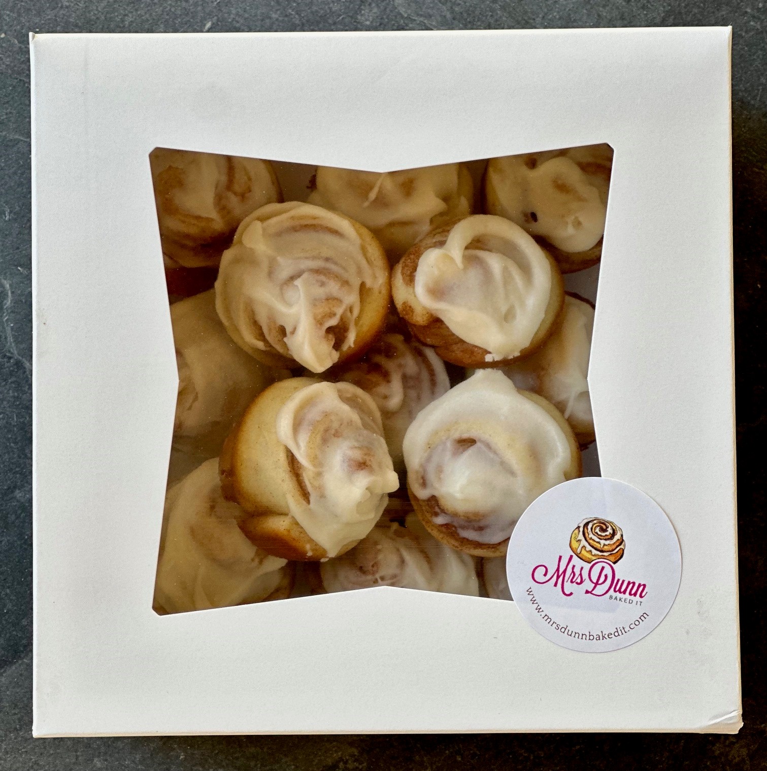 Miniature Classic Cinnamon Rolls. 12 bite-size rolls to a treat box.