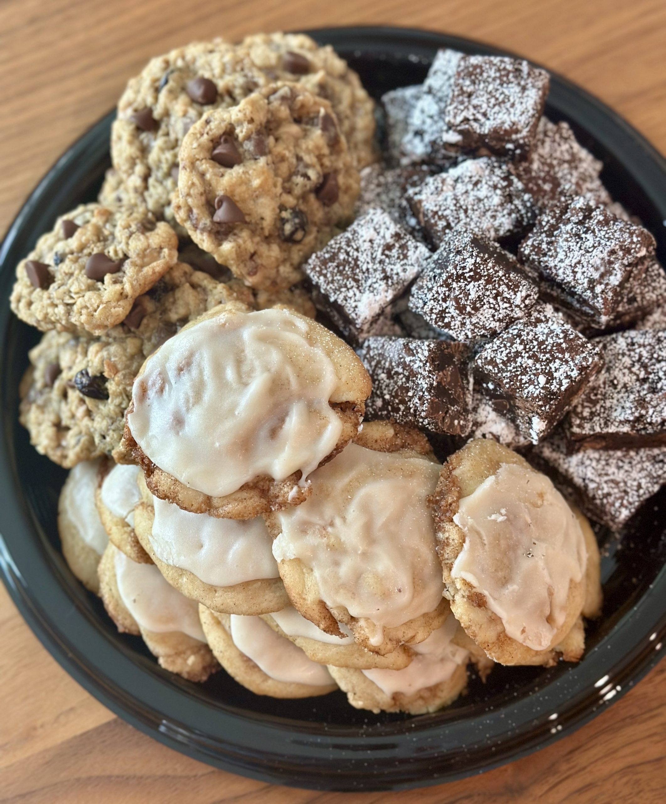 You asked and we answered! This 12 inch platter holds 3 dozen assorted goodies. Choose up to three of the following offerings: mini cinnamon rolls; super fudgy brownies; milk chocolate chip cookies; brown butter rice krispy treats; monster cookies; cowboy cookies; love cookies.